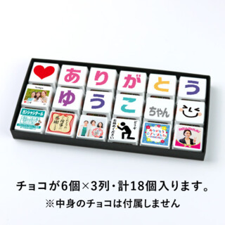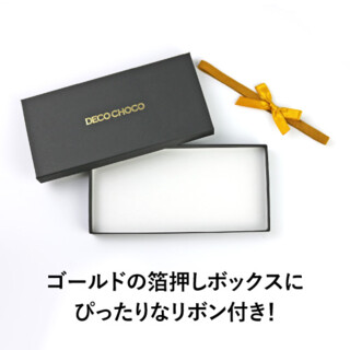 リッチな箔押しの紙箱に、リボンゴムが付いたボックス。 DECOチョコが18個入るサイズで、メッセージの組み合わせにぴったり! リボンはゴムを掛けるだけで取り付け可能。結ぶ手間もありません! 箱全体のサイズ:約195×90×17mm ============================== ※チョコは別売りです。 ※お箱詰めは行っておりません。 商品到着後、お客様ご自身でのアレンジ作業をお願いいたします。 ==============================