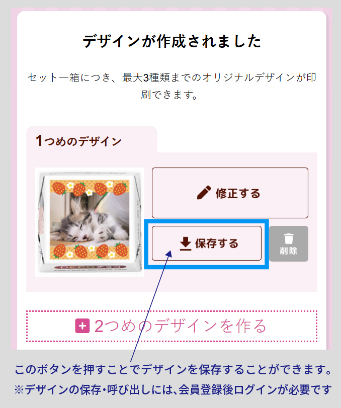 デザインの作成が完了した時点で「保存する」を選択するとデザインが保存され、