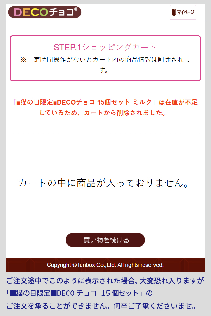 大変恐れ入りますが、お客様の操作中に在庫切れによりご注文が完了できなかった場合は、